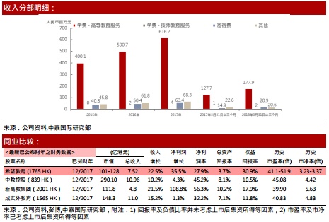 经营业绩方面,2015-2017年公司营收分别为4.87亿元、6.14亿元和7.52亿元,增长率分别为26.2%和22.5%;以高等教育服务学费为主,近三年占总收入的比例均超过80%。学费及住宿费等款项具有递延收入的性质,截至2018年3月31日,学费及住宿费等合约负债结余3.3亿元,将在未来按比例被确认为收入。过去三年,期内溢利分别为0.65亿元、1.55亿元和2.10亿元,净利润率分别为13.44%,25.19%和27.86%,利润率明显提升,但仍低于同类上市教育企业,还有提升空间。