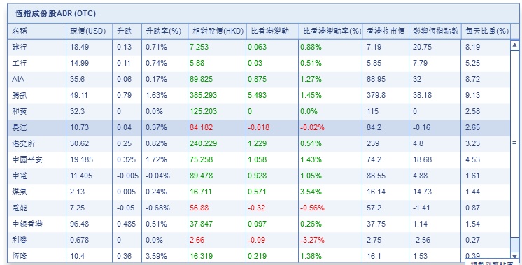 智通财经APP获悉,截至7月25日美股收盘,港股ADR指数全日上涨,按比例计算,收报29216.21点,升295.31点或1.02%。大型蓝筹全线上涨,滙丰控股收报76.10元,较港收市升1.05元;腾讯控股收报385.29元,较港收市升5.49元。
