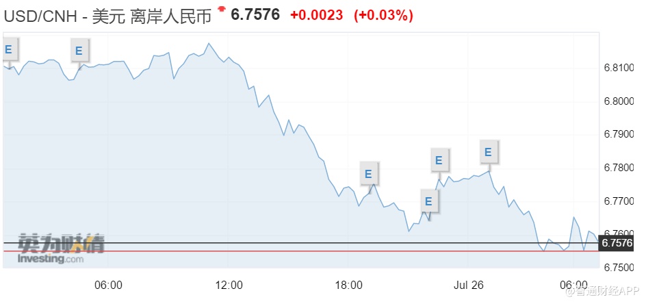 智通财经APP获悉,离岸人民币兑美元涨破6.76关口,日内涨超500点,触及日高为6.7534。截至发稿,报6.7576。