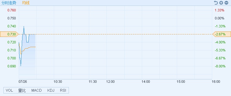 智通财经APP获悉,太和控股(00718)今早复牌,曾挫8%至0.69元,截至9时57分,跌2.67%,报价0.73港元,成交额454.4万。