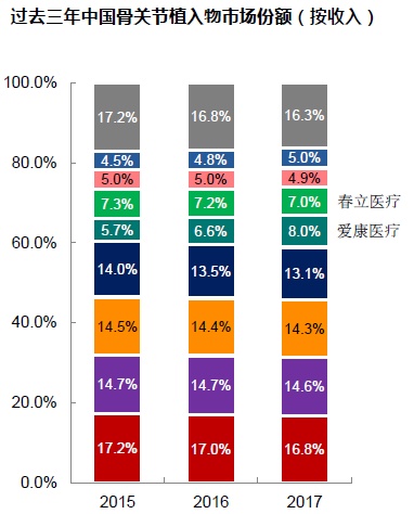 目前中国关节植入物市场高度集中,前几名均被跨国企业所主导,近年随着中国医疗改革进展及政府透过有利的政策支持中国公司,预期境内公司将透过提升其产品组合而增加于关节类植入物的市场份额。