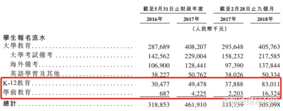 从付费情况或许也可以看出这一点。智通财经APP了解到,截至2018年2月28日止的9个月,公司的大学教育分部付费学生人次为85.2万,占总付费人次的59.1%;学前教育分部付费学生人次为46万,占比31.9%。而K12教育分部付费学生人次仅占9%。