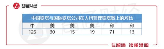 除了数量上占据绝对优势,中国铁塔的资产运营效率也明显高于国际同类公司。智通财经APP获悉,目前中国铁塔人均管理铁塔有126个,人均管理资产超过2100万元;而美国铁塔人均管理铁塔数则不到30个,远低于中国铁塔。