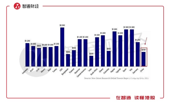 尽管中国铁塔在数量和生产率上处于上风,但铁塔租金却在国际排倒数。据New Street Research数据,中国铁塔租金以750美元/月的价格排名全球倒数第三,而美国铁塔以2000美元/月的价格一枝独秀,称霸全球。