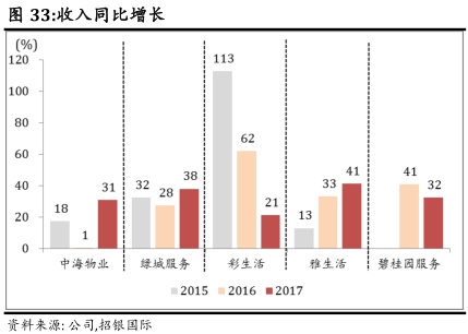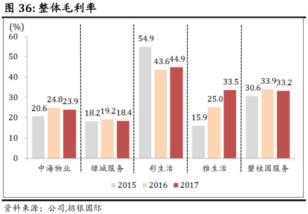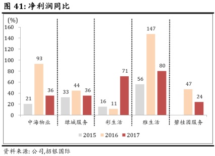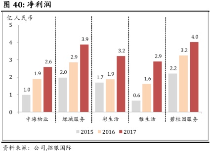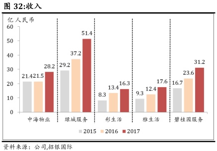从收入角度上看,2017年绿城服务收入最高,达51.4亿。尽管彩生活拥有最多的管理面积,但由于平均服务单价偏低,收入是5家当中最低的。从收入增长上看,表现最好的是雅生活(41%),其次是绿城服务(38%)和碧桂园服务(32%)。