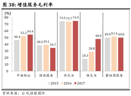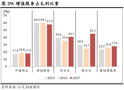 多家物业公司已经发力增值服务。由于增值服务的商业模式不同,增值服务的毛利率相差较大。增值服务享有的高毛利率提高了企业开展增值业务的积极性,逐渐成为利润重要贡献来源。其中绿城服务的增值服务业务对毛利贡献超过50%。我们认为增值服务占利润的比重将会继续增加。
