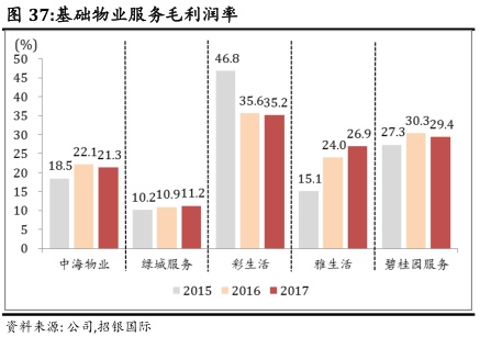 公司之间的毛利率差异较大,主要由于存量项目差异所致。酬金制项目利润率明显高于包干制项目;办公和商业物业项目高于住宅项目;新落成物业项目高于老旧物业项目;中高端高于低端物业。尽管绿城服务收入最高并且保持了较快增长,但由于存量项目的基础物业服务毛利率偏低,绿城服务的整体毛利率偏低。