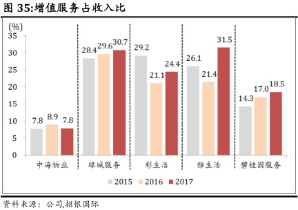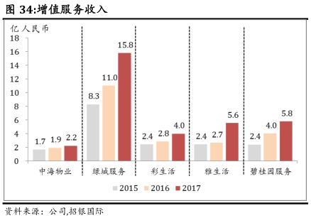 从收入构成上看,基础物业服务仍然是最大的来源,但增服务的比重总体呈上升趋势。其中彩生活、绿城服务在开展增值服务业务上较为领先,增值服务占收入比重均超过30%。而中海物业在开展增值服务板块方面相对落后于民营企业。