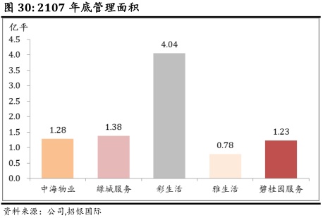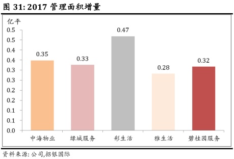 我们选取5家在港上市,具有一定规模的物业企业做比较。从管理面积上看,截至到2017年底,彩生活拥有最大的管理面积(4.04亿平方米),其次是绿城服务(1.38亿平方米)和中海物业(1.28亿平方米)。从面积净增量上看,彩生活略微高出,其他4家增量相当。