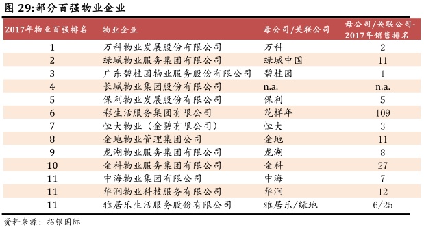 在日趋激烈的市场环境下,部分背靠大型开发商的物业公司将受益于母公司给予的项目支持,发展势头较中小型物业公司更好。同时,大型开发商主要在一二线城市进行开发,项目优质,服务价格较高,享有更好的区位布局。此外,依托母公司资源,物业企业开展增值服务的空间更大。2017年百强物业企业排名靠前的企业均有大型开发商作为依靠。