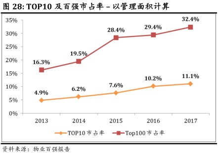以管理面积计算,百强物业公司中TOP10的市占率由2013年底的4.9%逐步增加到2017年底的11.1%。而TOP100市占率由2013年底的16.3%逐步增加到2017年底的32.4%。