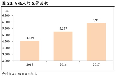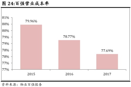 物业管理行业逐步由劳工密集,专注于传统的物业管理服务向集约化、自动化、智能化、互联化转变。各家大型物业企业已经初步建立智能化的物业管理系统,如停车缴费、门禁系统、物业缴费系统、手机APP等。面对不断攀升的人力成本,科技化、智能化的物业管理将是提高运营效率和节约成本的重要手段。同时,手机APP也是物业企业主要O2O平台。2017年百强企业实现智能化投入均值为716万元,较2016年提高49.8%,TOP10企业全部拥有自己的APP。人均管理面从2015年4539平提高至5913平,营业成本率也呈缓慢下降趋势。