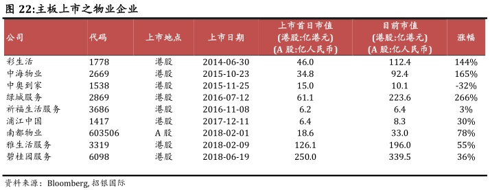2014年彩生活(01778)作为首家中资物业股上市后,市值一度超过母公司花样年,成为市场热点。由于基础物业管理业务拥有稳定的现金流,收入风险低,风险溢价小等特点,越来越多的物业公司开始进入资本市场。