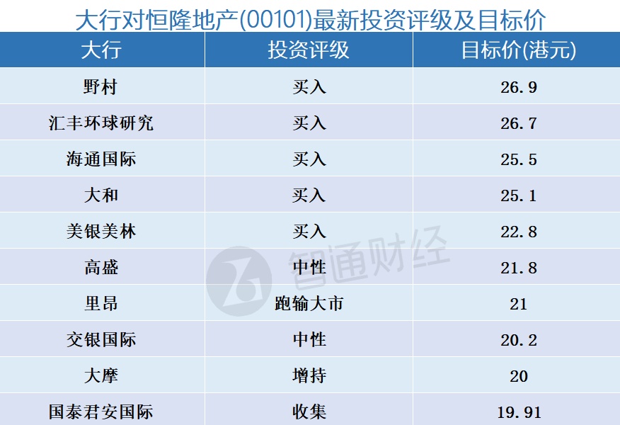 经智通财经APP整理,大行对恒隆地产(00101)最新投资评级及目标价如下,