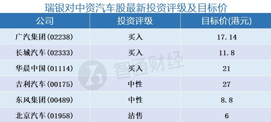 四、瑞银对中资汽车股最新投资评级及目标价