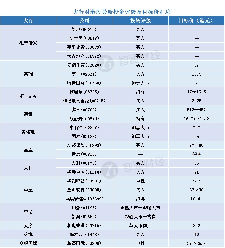 六、大行对恒隆地产(00101)最新投资评级及目标价