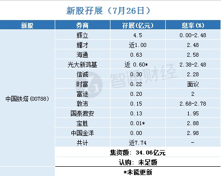 截至7月26日,正在招股的新股中,耀才、辉立等11家券商为中国铁塔(00788)借出孖展金34.06亿港元,认购未足额;耀才、辉立等7家券商为希望教育(01765)借出孖展金3.2亿元,认购超购逾3倍。具体情况如下:
