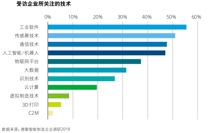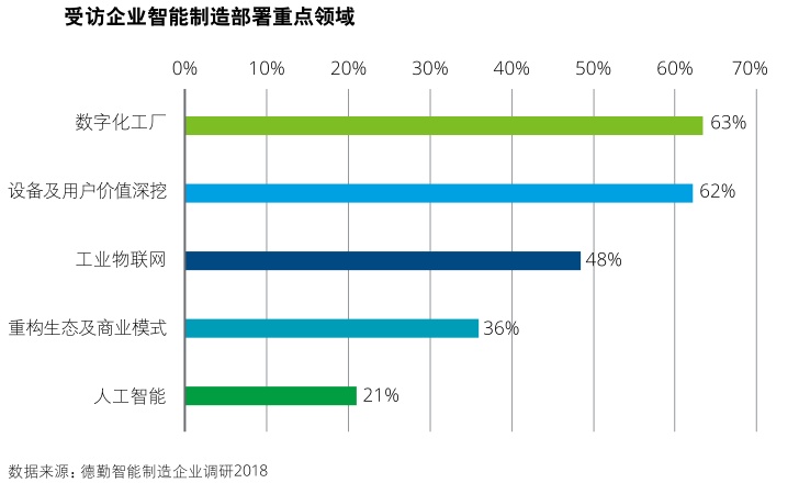 值得一提的是,德勤调查发现,逾半数受访企业已经在制造和管理流程运用到人工智能,另有46%的受访企业已经或计划在产品和服务领域部署人工智能。此外,相对欧美企业,中国制造企业的硬件设备和厂房普遍较新,更容易实现设备连接和厂房改造。 此次调研的受访企业认为,中国工业企业智能制造五大部署重点依次为:数字化工厂、设备及用户价值深挖、工业物联网、重构商业模式以及人工智能。