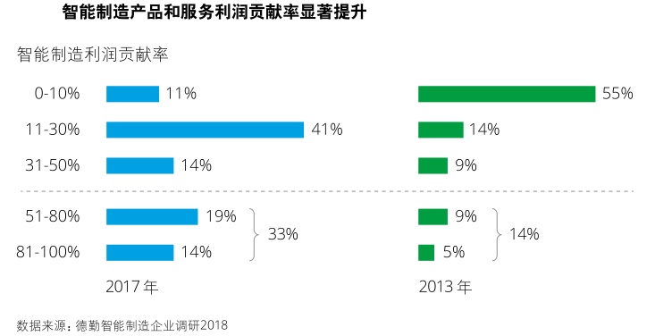 智通财经APP注意到,在财务方面,智能制造对企业的利润贡献率大幅增加,利润贡献率超过50%的企业占比从2013年的14%增至2017年的33%,而大部分受访企业(41%)其智能制造业务的利润贡献率在11-30%的区间,利润来源则包括生产过程增效和产品服务价值提升。