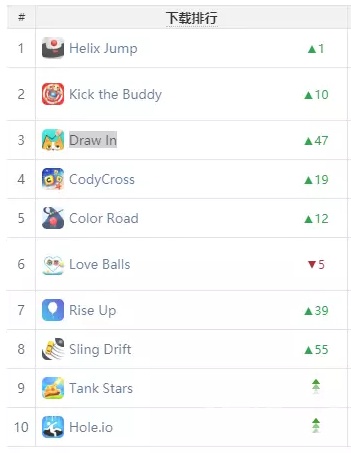 6月下载榜上,Voodoo的《球跳塔》上升一名成为下载量冠军。Voodoo近期推出的新品《TENKYU》很快又拿下了下载榜榜首,Voodoo已经深谙休闲游戏爆款之路啊。此前的下载量冠军《恋爱球球》下滑了5位,排名第六。而Super Tapx的另一款游戏《完美的线》发力了,冲入了下载量前十,排名第3。