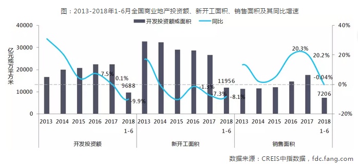 供应:2018年上半年,商业地产开发投资额9688亿元,同比下降9.9%,新开工面积11956万平方米,同比下降8.1%;需求: 2018年上半年,全国商业地产销售面积达7206万平方米,销售规模依然较大。