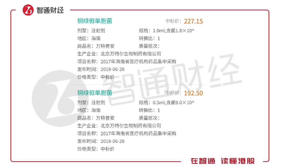何况万特尔生物还有一款已经非常成熟的产品——铜绿假单胞菌注射液。该产品主要由绿脓杆菌经培养杀菌后制备而成,能为接种后的病人提高免疫能力并降低感染的发生,主要用於恶性肿瘤的辅助治疗。截至目前,该产品主要覆盖在广东、安徽、湖南、辽宁和浙江等十个省份,其中,海南规格为1ML的中标价为227.15元、05ML为192.5元,价格相对较高。