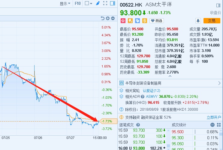 与此同时,该公司的每股基本盈利为3.46元,较去年同期下滑5.46%。中期派息1.3元(2017年为1.2元)。受溢利下滑的影响,ASM 股价三连跌,截至7月27日,累跌4.75%,报价93.8港元。