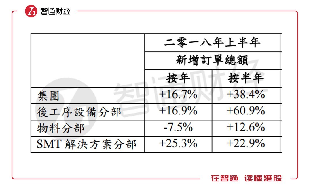 在ASM PACIFIC这份半年度业绩中,收入的快速增长是一大亮点,这主要得益于三大业务分部收入的同比增长。后工序设备分部、物料分部、SMT解决方案分部较去年同期分别增长14.4%、12.1%、24.6%。