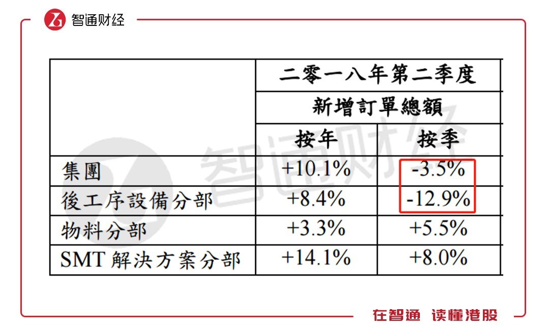 但瑜不掩瑕,透过二季度的新增订单情况,季节性增长放缓已有所体现。按季度算,由于后工序设备分部新增订单下滑12.9%,导致该公司二季度新增订单额下滑3%,物料分部、SMT解决方案分部按季的订单量也回落至一位数增长,淡季来临。