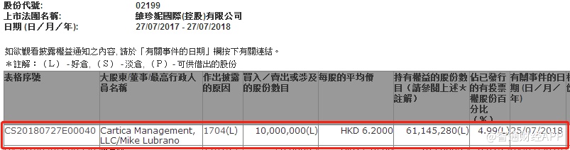 智通财经APP获悉,根据联交所资料显示,资产公司Cartica Management于本周三(25日)减持维珍妮(02199)1000万股,每股作价6.2元,总值6200万元,最新持股量降至4.99%。