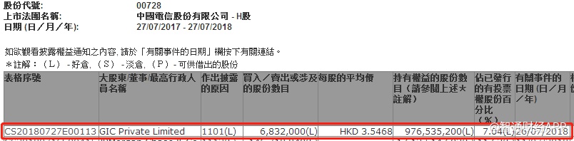 新加坡政府投资增持中电信(00728)683万股 每股作价3.55元