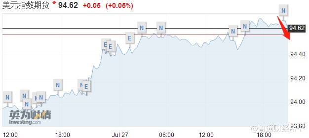 美国二季度GDP数据略微差于预期,美元指数短线微跌10余点,现报94.62。