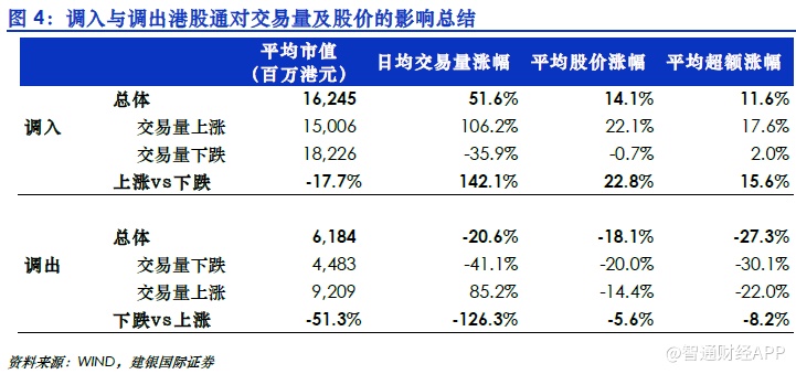 调出港股通除了对标的的流动性存在负面影响,也会拖累股价下滑。仍以同一个调出样本为例,标的调出后股价平均下滑18.1%,相对恒指跑输27.3个百分点。若将成交量变化差异因素考虑在内,成交量收缩的股票(市值较小)股价平均跌幅20.0%,跑输恒指30.1个百分点,分别低于成交量放大的股票(市值较大)5.6及8.2个百分点。但调出后成交量放大的股票依然跑输恒指22个百分点。因此,调入与调出港股通,除了通过影响标的的流动性来影响股价表现之外,也会直接对股价产生影响。