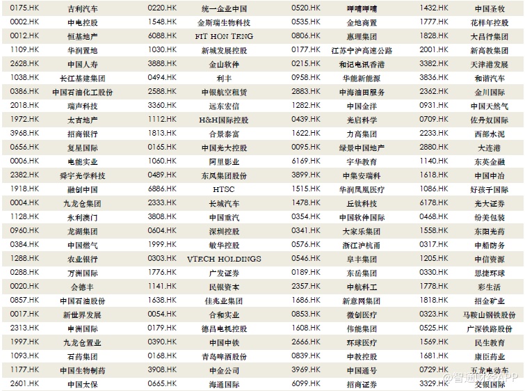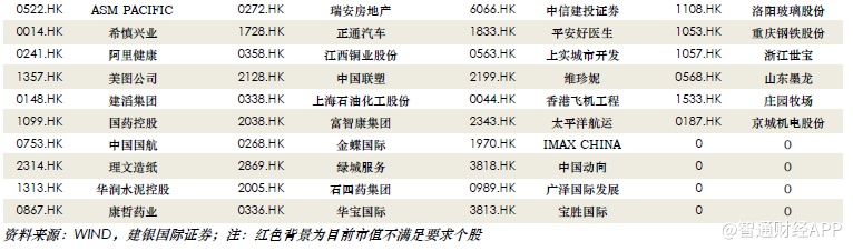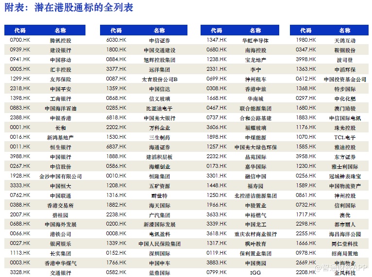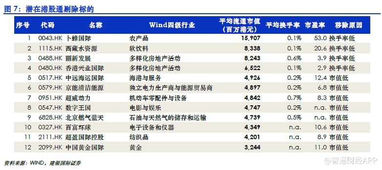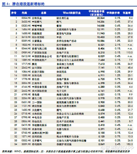 建银国际列出潜在港股通新增标的、潜在港股通剔除标的以及潜在港股通标的全列表: