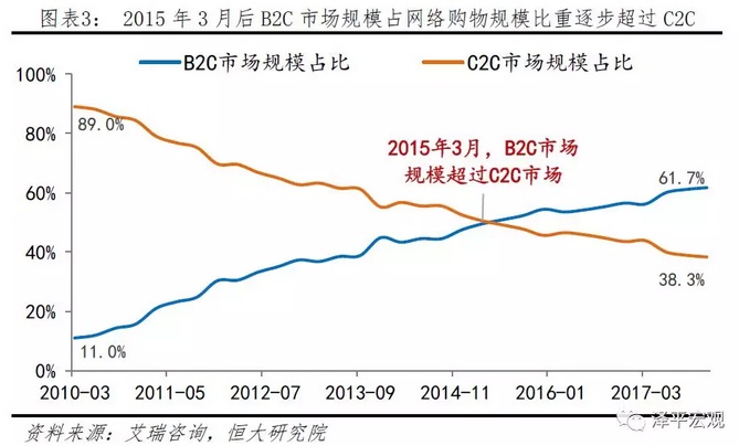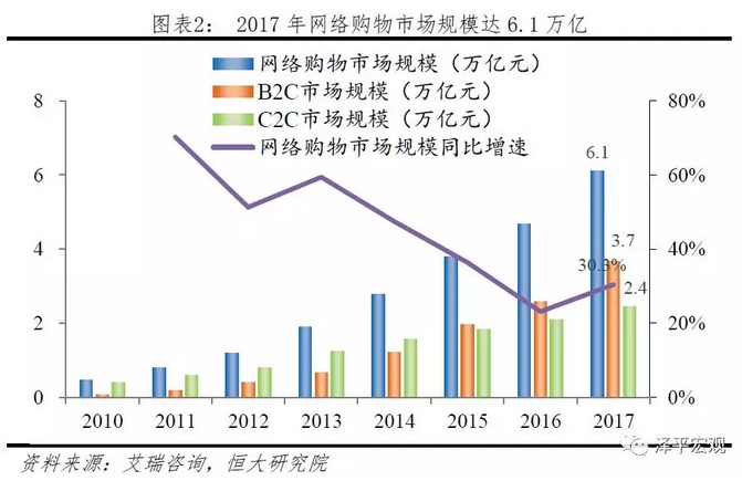 2017年网络购物市场规模达6.1万亿,同比增长30.3%,其中B2C市场规模占比62%。B2C的市场规模增速快于C2C市场,B2C市场规模占网络购物市场规模比重从2010年末的15%上升至2017年末的62%,C2C的市场规模占比相应大幅下降,说明经历近20年发展的电商行业逐步从C2C转向B2C,消费者从追求低价逐步转向追求产品品质。