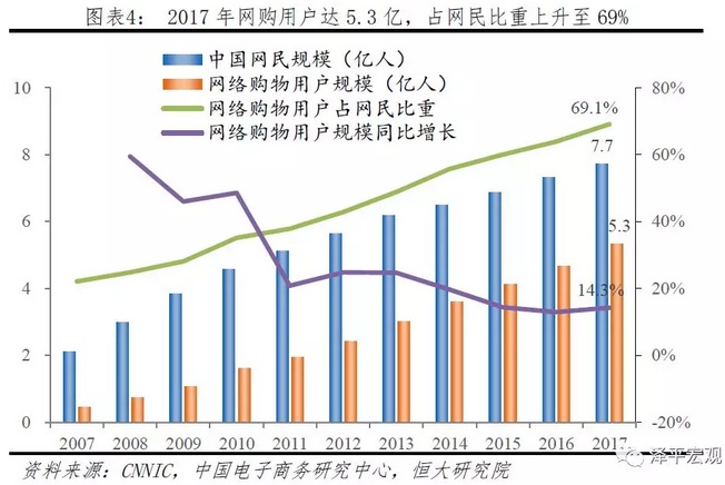 2017年网络购物用户达5.3亿人,同比增长14.3%,占网民比重上升至69%。网民中非网购人群仍有2.2亿,网购行业仍有上升空间。2017年中国网民规模达7.7亿人,网络购物用户规模达5.3亿人,非网购人群仍有2.2亿。网购用户占网民规模的比重从2007年的22%上升至2017年的69%。但网购用户规模增速逐渐下降,2017年同比增速降至14.3%,说明网购用户的大规模增长阶段接近尾声,网购用户规模将以较低增速逐渐逼近网民规模,网民规模同时也是网购用户规模的“天花板”。