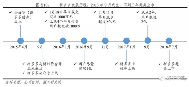 2015年9月,拼多多公众号成立,宣告着拼多多的正式面市。2017年1月9日,拼多多小程序上线,是微信第一批小程序,拼多多的迅速崛起非常依赖微信场景。