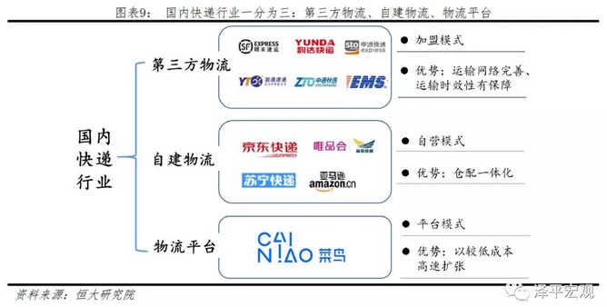 3)物流:国内快递行业格局一分为三:顺丰为代表的第三方物流、京东为代表的自建物流、菜鸟为代表的物流平台。第三方物流包括顺丰、中通、圆通、申通、韵达、EMS等快递公司。自建物流包括京东物流、唯品会物流(品骏快递)、亚马逊物流、苏宁物流等。物流平台包括菜鸟网络等。第三方物流侧重于运输网络的搭建,强化运输时效性的保障,采用的是加盟模式。自建物流优势在于仓配一体化,采用自营模式。物流平台优势在于以较低成本高速扩张,采用的是平台模式。