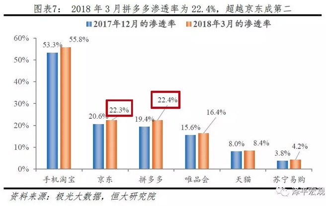 根据极光大数据统计,手机淘宝高居电商平台渗透率第一名,2018年3月拼多多渗透率22.4%,超过京东成第二。渗透率指的是安装某电商APP的设备数/市场总设备数。2018年3月拼多多渗透率为22.4%,高于京东的渗透率22.3%,拼多多渗透率成市场第二。