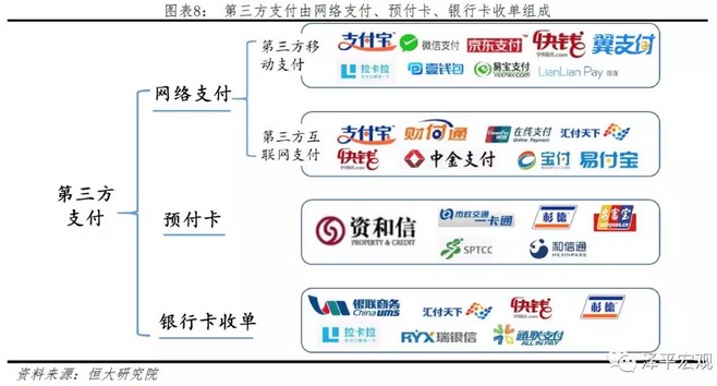 2)支付:第三方支付由网络支付、预付卡、银行卡收单组成。第三方支付指的是非金融机构作为收付款人提供的网络支付等服务,包括网络支付、预付卡、银行卡收单。其中,网络支付包括第三方互联网支付和第三方移动支付,分别指PC端和移动端的支付。