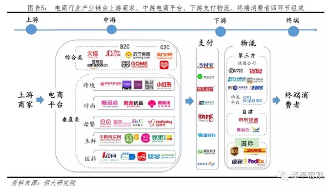 1.2产业链:由上游商家、中游电商平台、下游支付物流、终端消费者组成