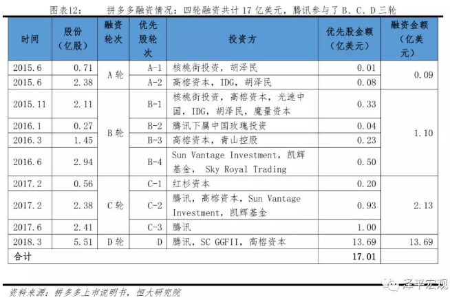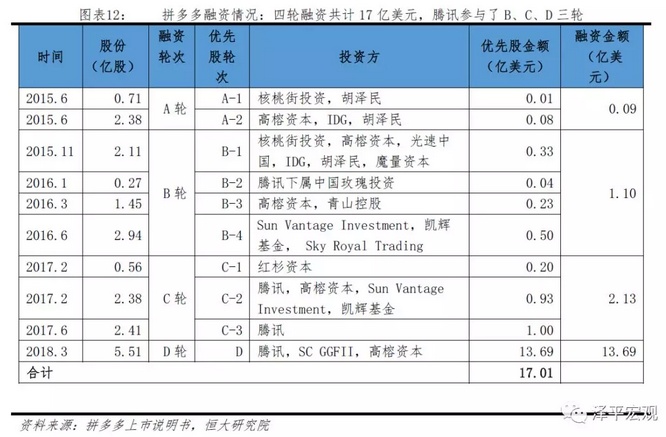 融资历程:估值快速增长,四轮共计融资17亿美元,腾讯入股。拼多多经历了四轮融资,最新一轮在2018年3月拼多多D轮融资13.69亿美元,投资方包括腾讯、高榕等。腾讯共参与了B、C、D三轮融资。2018年6月30日,拼多多向SEC提交招股说明书赴美上市。