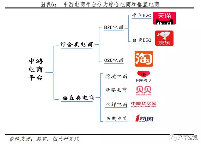 1)电商平台是电商产业链核心环节,按照销售品类的不同分为综合类电商和垂直类电商。综合类电商销售的品类更加全面和丰富,包括天猫京东为代表的B2C电商和淘宝拼多多为代表的C2C电商。B2C电商内部又分为平台B2C和自营B2C,如天猫是为入驻品牌商家提供平台为主,京东则是自营为主。平台B2C主要通过佣金、服务费、广告费、增值服务等方式盈利;自营B2C获得了某些品牌的代理权或者经销权,主要通过赚取差价盈利。垂直类电商指的是销售某一领域产品的比较专业的网站。如跨境电商主打跨境进口商品特别是美妆、轻奢品等产品的销售,如网易考拉、小红书;母婴电商主打奶粉、纸尿裤等母婴产品的销售,如贝贝、蜜芽;生鲜电商主打水果、海鲜、肉禽等产品的销售,如中粮我买网、天天果园;医药电商主打药品的销售,如1药网、康爱多。