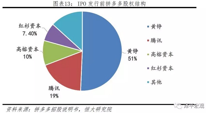 股权结构:黄峥拥有控股权以及最大的投票权。此次IPO发行前拼多多创始人兼CEO黄峥占股50.7%,对公司拥有控制权;腾讯占股18.5%,是第二大股东;高榕资本占股10.1%,红杉资本占股7.4%。预计IPO后,创始人兼CEO黄峥将占股46.8%,拥有89.8%的投票权,腾讯所占股比为17.0%,投票权为3.3%;高榕所占股比为9.3%,投票权为1.8%;红杉所占股比为6.8%,投票权为1.3%。