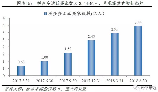 拼多多成立于2015年9月,伴随着微信群里的拼团链接以及综艺节目里“魔性”的广告,实现爆发式增长。活跃买家数从2017年第一季度的0.68亿快速增长至2018年第二季度的3.44亿,一年半时间增长400%。
