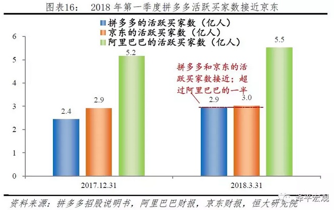 (3)供给端——拼多多活跃商家仍有极大增长空间。截至2018年3月31日,拼多多的活跃商家超过100万家,相比阿里、京东商家数量仍有极大增长空间。