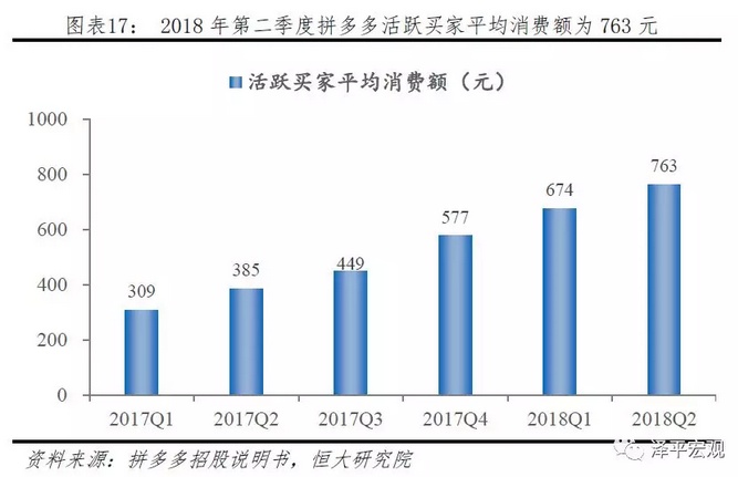 活跃买家平均消费额:2018年第二季度拼多多活跃买家平均消费额是763元,保持快速增长。2017年第一季度拼多多近12个月活跃买家平均消费额为309元,2018年第二季度拼多多近12个月活跃买家平均消费额为763元,一年半时间翻倍增长。