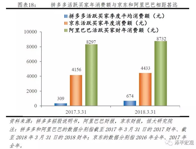 (1)拼多多借助微信,平台流量大,且商家较少,竞争相对没有那么激烈。拼多多成立时间不到三年,商家虽然增长迅速,但与淘宝的商家数相比仍然比较少。截至2018年3月31日,拼多多平台的活跃商家超过100万;2016年,淘宝有940万商家。