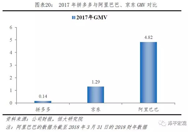 拼多多GMV与阿里巴巴和京东距离较大,但增速迅猛。2017财年拼多多GMV为1412亿元,2018财年(截至2018年3月31日的一年)阿里巴巴GMV为48200亿,其中淘宝和天猫分别是26890亿和21310亿,2017年全年京东GMV是12945亿,拼多多差距依然较大。
