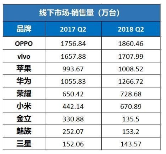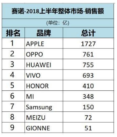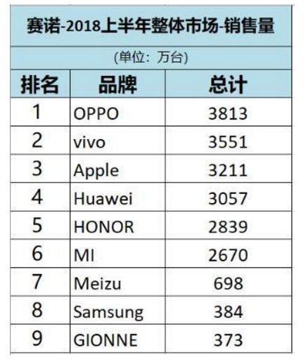 OPPO上半年整体市场销售量总计3813万台,领先第二名近300万台。